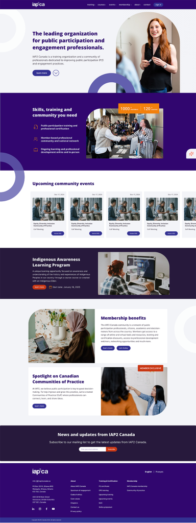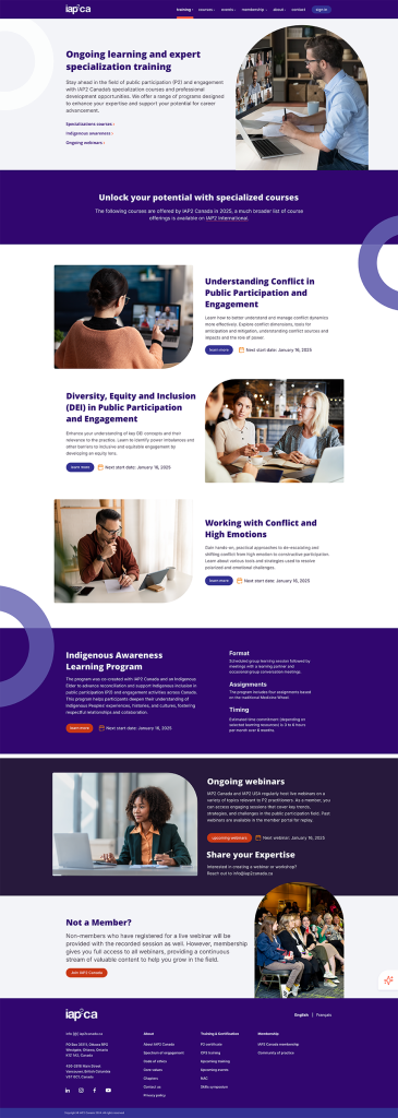 The website is a major project for IAP2 Canada and requires various system changes. To start it, I performed a content audit and created the website content strategy for the new platform. The strategy was followed by the design of the website following the updated brand guidelines from NAC. This website is meant to be built on WordPress.